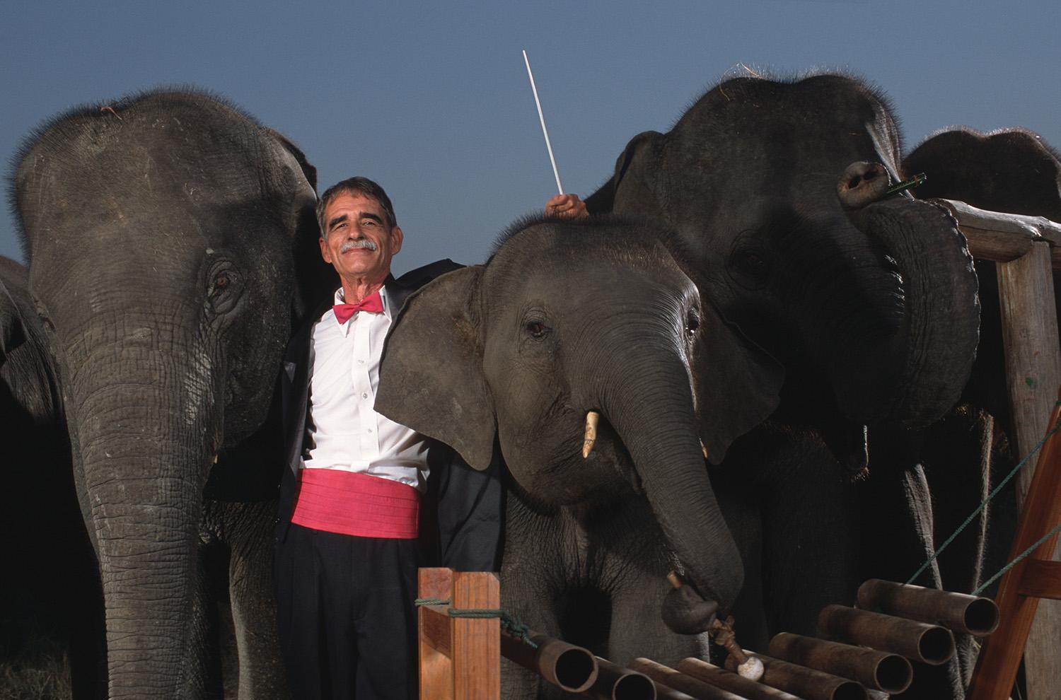 An environmental portrait is one where you stick somebody in their environment. In other words, you show them doing what they do with a background that tells the story. People magazine had asked me to photograph Richard Lair, one of Thailand’s leading experts on elephants who was working for the Thai Elephant Conservation Center. As part of the Centers fund raising efforts he had started an elephant orchestra – yes they really can play instruments and enjoy it. (Although I am not sure how the sales of the music CDs went).